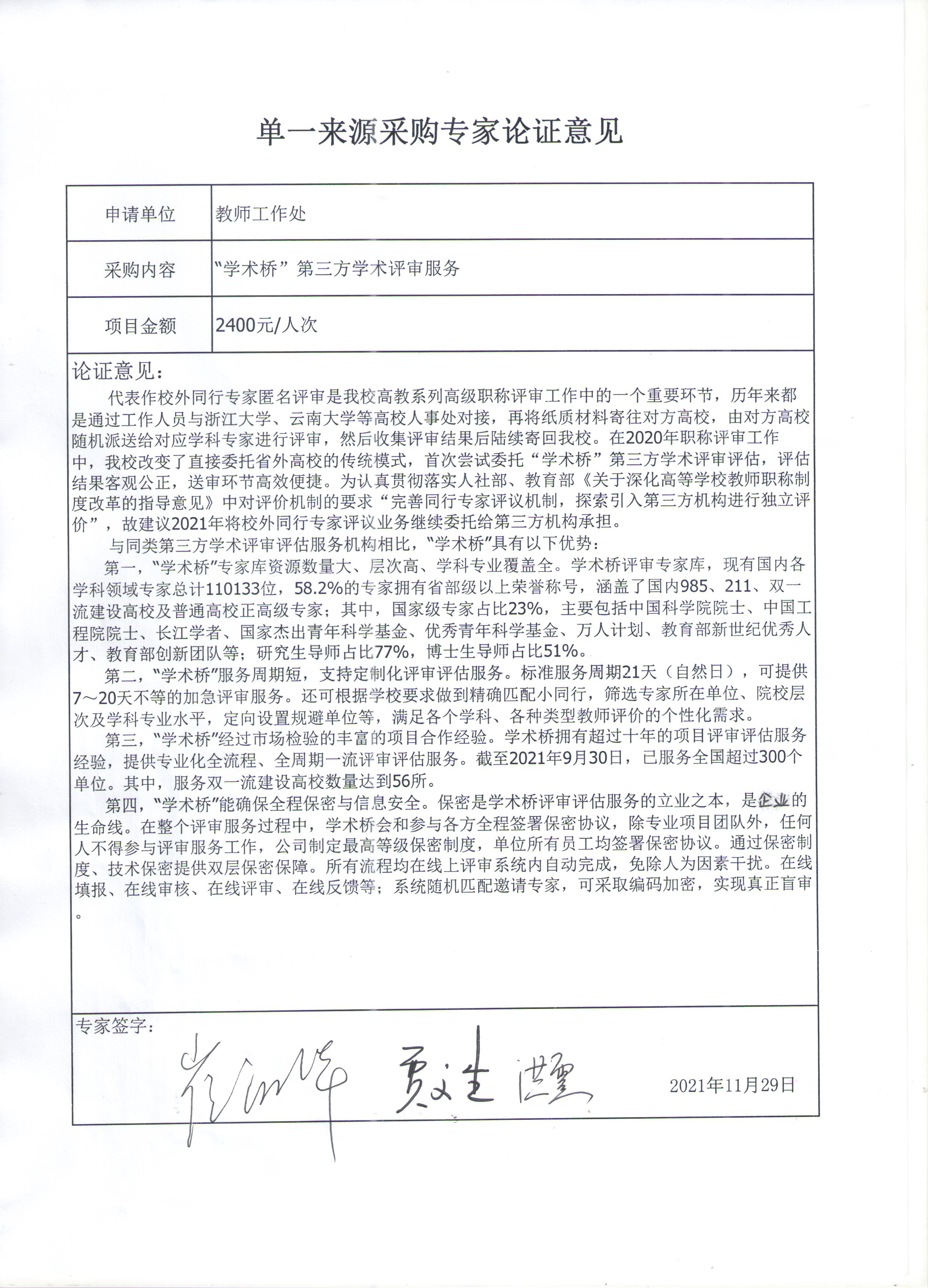 鉴于学术桥(北京)教育科技有限公司一是专家库资源数量大、层次高、学科专业覆盖全,二是服务周期短,支持定制化评审评估服务,三是经过市场检验的丰富的项目合作经验,四是能确保全程保密与信息安全。根据相关法规及政策规定,结合本项目需求,建议采用单一来源方式采购,并向“学术桥(北京)教育科技有限公司”采购。